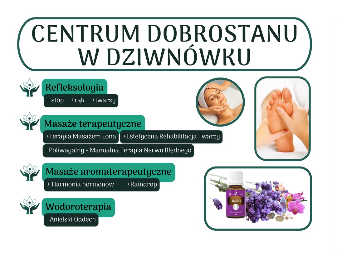 Holistyczna terapia ciała i emocji w Dziwnówku. Oferuję autorskie terapie manualne i refleksologiczne, które wspierają ciało, emocje i układ nerwowy. W ofercie m.in.: sesje 1:1 metodą Yagera, Kompleksowa Refleksoterapia 360° (stopy, dłonie, twarz + terapia wodorowa), Masaż PROF 123, Masaż poliwagalny, Kobido, Masaż mięśniowo-powięziowy pleców, Rebozo, Estetyczna Rehabilitacja Twarzy, Terapia masażem łona, Access Bars i inne. Prowadzę też warsztaty i sesje online. Zapraszam do przestrzeni, w której znajdziesz równowagę, ulgę i wewnętrzny spokój. Gabinet: Dziwnówek | Sesje stacjonarne i online